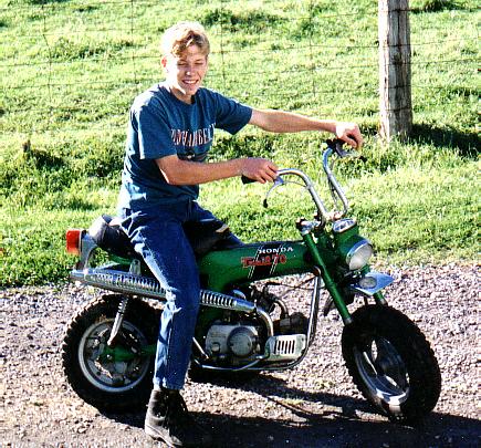 first bike: 1971 Honda CT70 air cooled 4-stroke. Special edition 4 speed with clutch from Cali. I put 900 miles of abuse on this bike through the full winter, jumps, and even the 4ft deep creek numerous times. It had the gas tank under the flip up seat, and fold down bars for easy storage. It stupidly had rubber pegs and I stupidly wore rubber boots. Any drop of water and my feet would slip off and burn my leg on the overly exposed exhaust. I was 12yrs old.